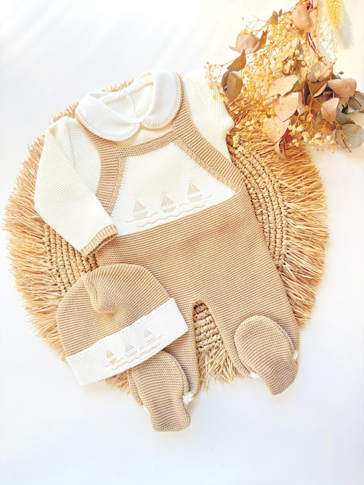 Diseñado con mimo para los primeros días de vida, incluye peto largo, jersey y gorrito a juego, todo confeccionado en algodón 100 % suave y delicado con la piel del bebé. 🌿